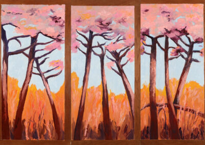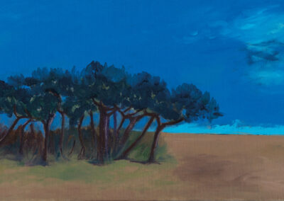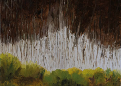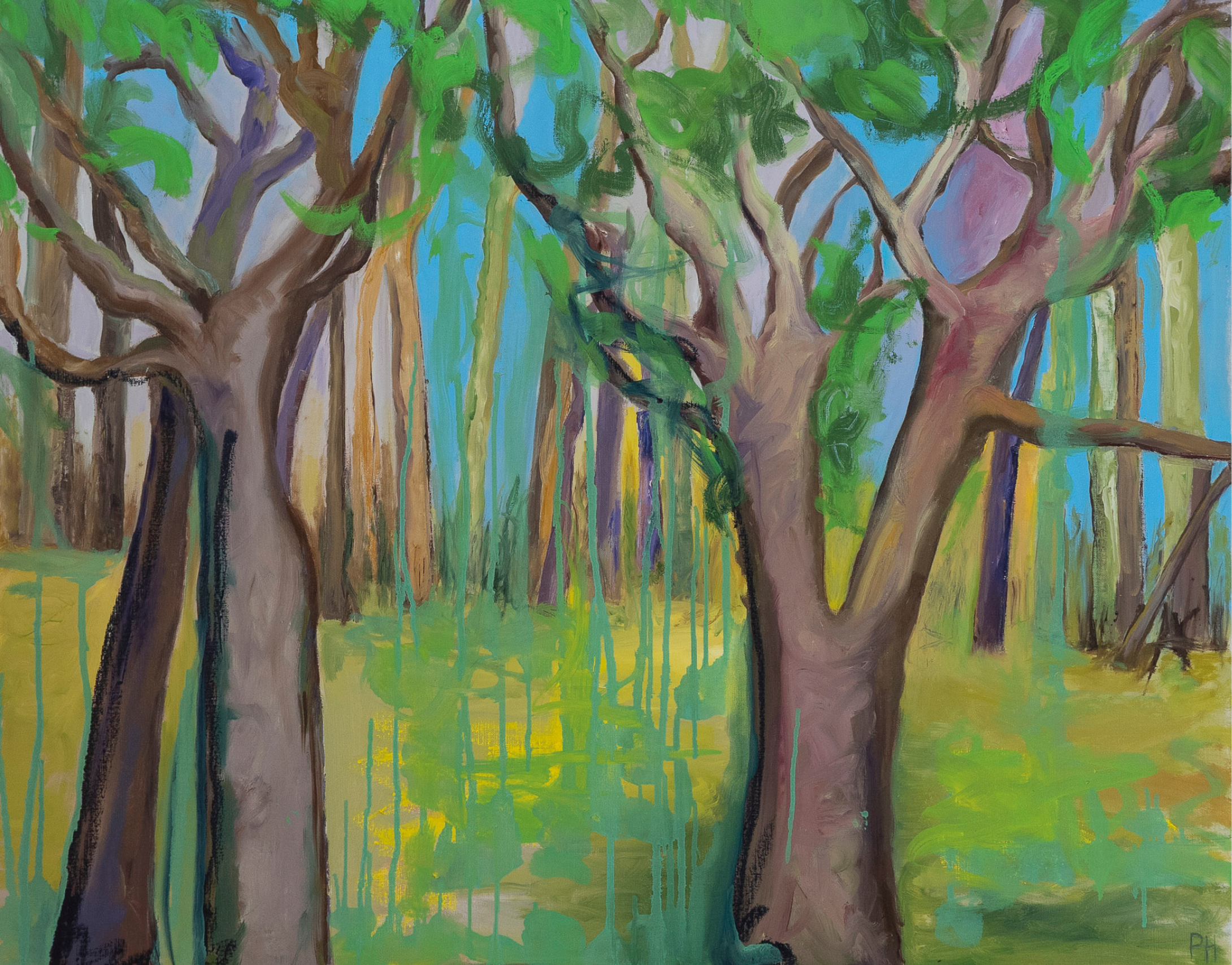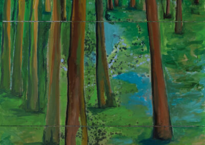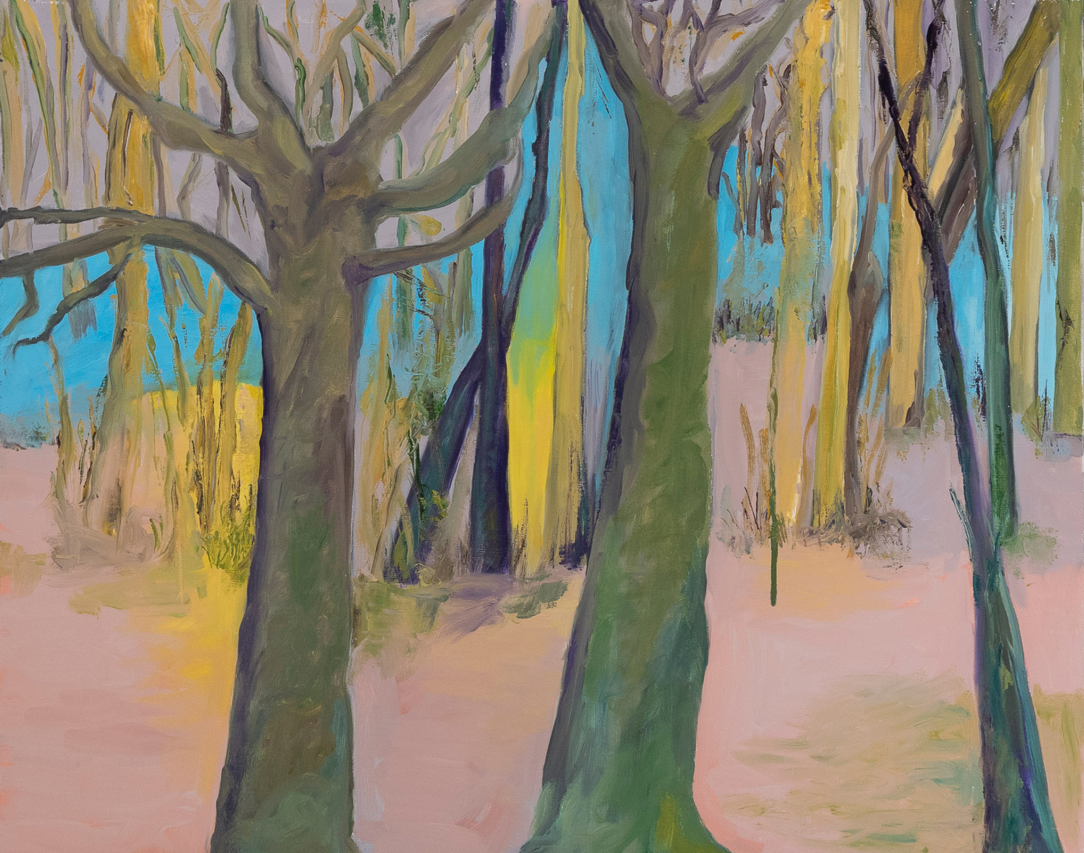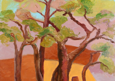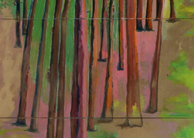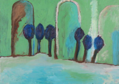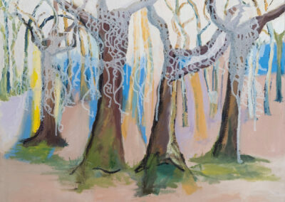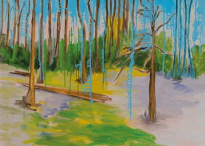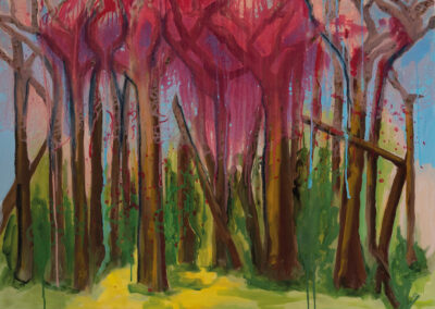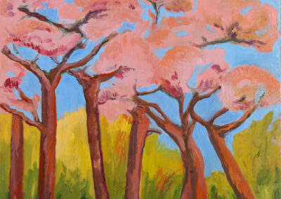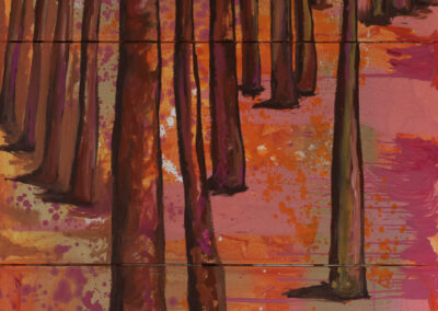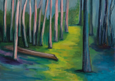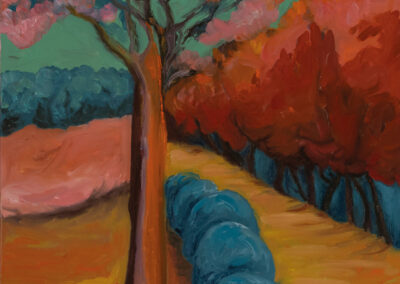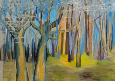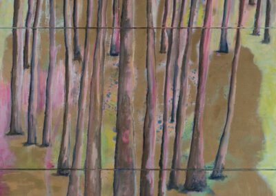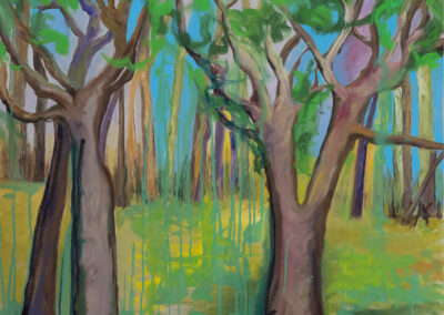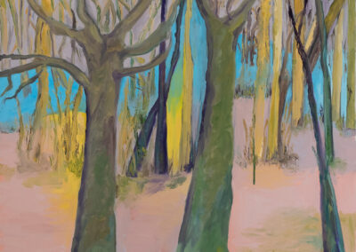 Les arbres observés, tendus entre ciel et terre, silencieux et également bruissants de mille vies minuscules, dansent en couleur d’une façon tout à fait personnelle sous mes pinceaux.