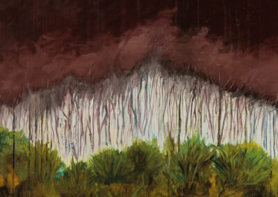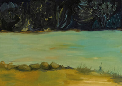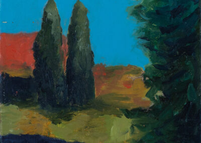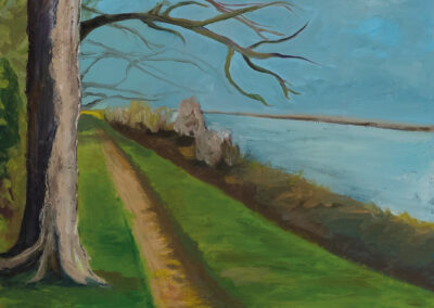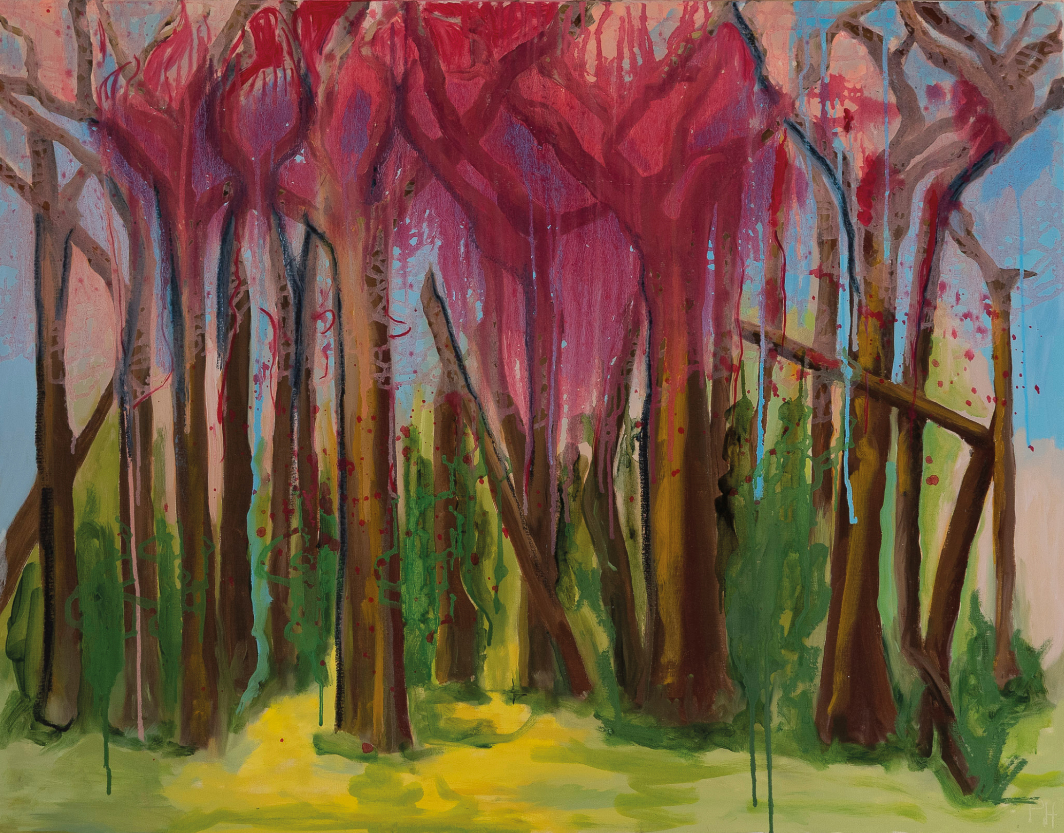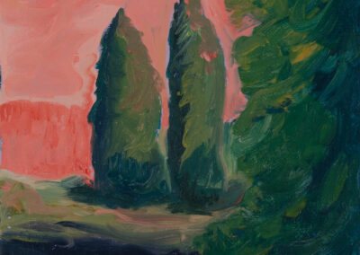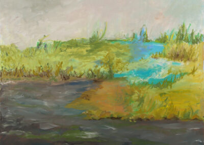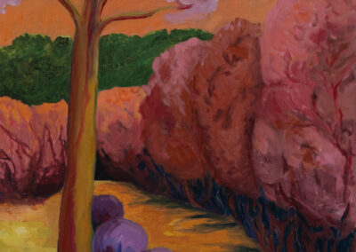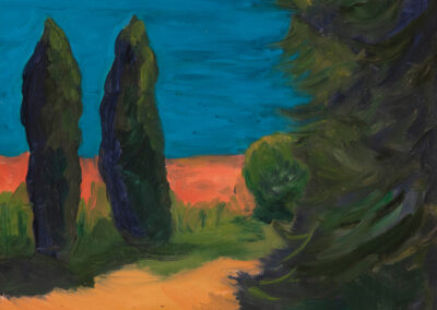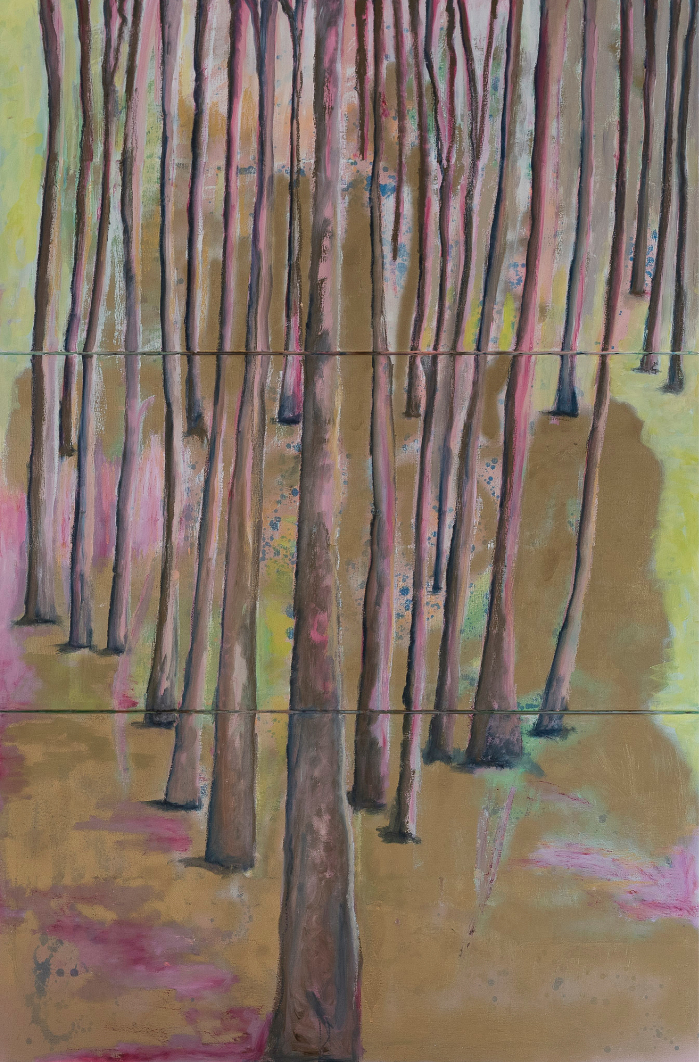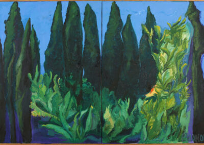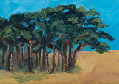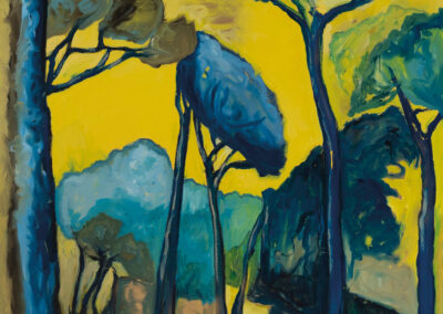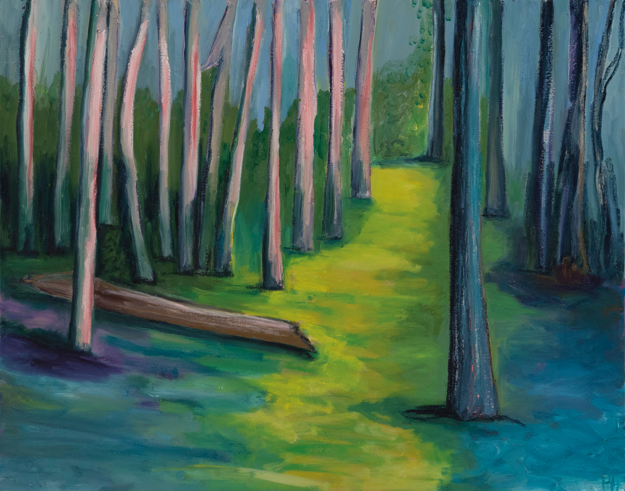 Les arbres observés, tendus entre ciel et terre, silencieux et également bruissants de mille vies minuscules, dansent en couleur d’une façon tout à fait personnelle sous mes pinceaux.